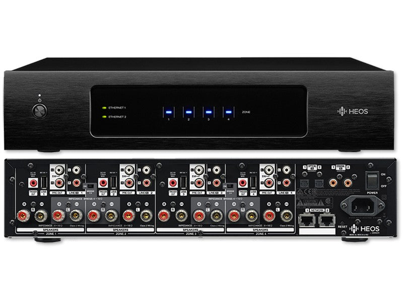 Rated at 60 watts per channel into each of the 8 channels (20Hz~20kHz, .05% THD, 8 ohms, All Channels Driven), 1 or 2 stereo amp pairs can be bridged for single channel high power output (130 watts), and the HEOS Drive HS2 features low impedance drive capability (4 ohms).