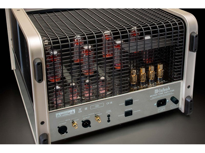 Like the original MC3500, the MC3500 Mk II has a fully balanced driver section that utilizes three 12AX7A and one 12AT7 vacuum tubes. The first 12AX7A is the differential input amp; the second is the buffer/driver for the voltage amp; the third is the voltage amp. The 12AT7 is the buffer/driver for the EL509S output tubes. All the vacuum tubes are located behind the power and output transformers, and are covered by a 12-gauge stainless steel wire cage with a black powder coated finish. The cage is shaped so that our patented, gold-plated Solid Cinchâ„¢ speaker binding posts are easily accessible even when the cage is installed.