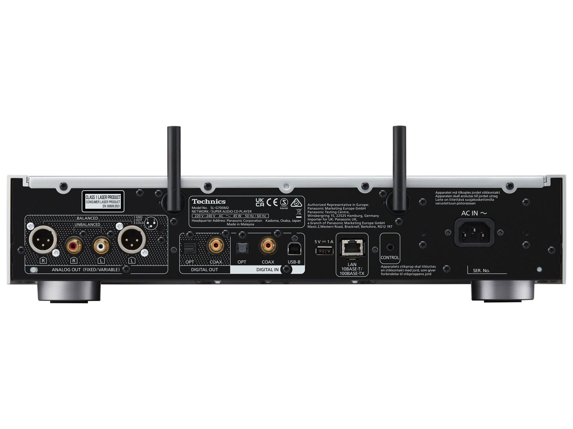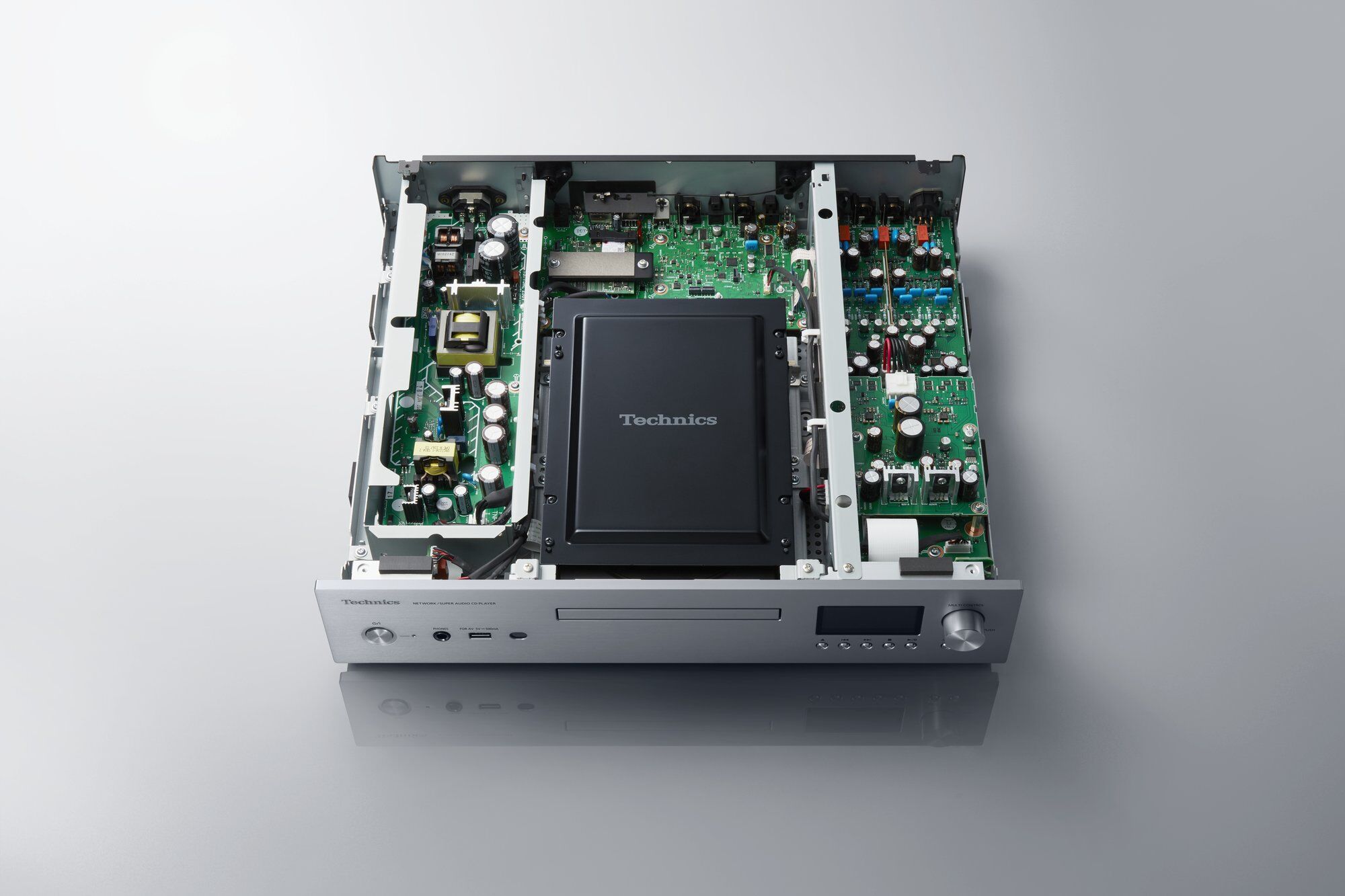Technics’ Multi-Stage Silent Power Supply employs three-stage noise suppression: high-speed 300 kHz switching power supply, low-noise regulation, and the newly developed Current Injection Active Noise Cancelling technology that applies inverse-phase current to eliminate unwanted noise components. The four-section chassis configuration features a high-rigidity construction with 7mm thick aluminium front panel, aluminium die-cast disc tray, and high-stability SACD mechanism. A dedicated System Control port (3.5mm jack) enables seamless integration with the Technics SU-G700 amplifier for complete system control. Dimensions: 430 x 98 x 407mm (W x H x D), 12.3kg.