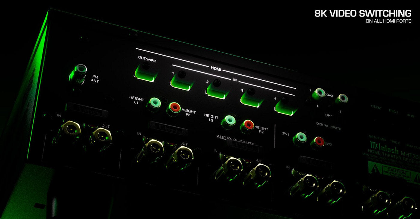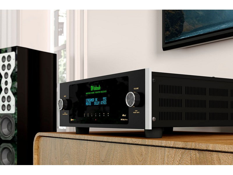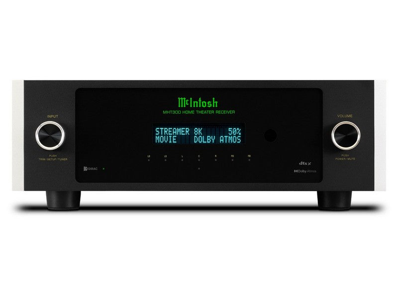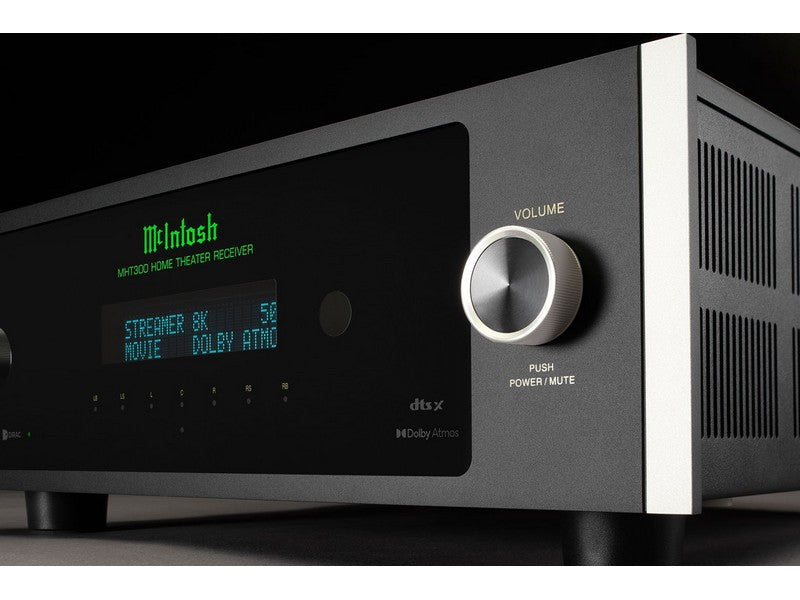 The McIntosh MHT300 Home Theater Receiver (or AV Receiver or AVR) is an uncompromising 7.2 (or 5.2.2) channel home theater powerhouse sure to heighten your emotional connection to what you are watching. With support for breathtaking 8K/60Hz and 4K/120Hz video and leading home theater surround sound audio formats Dolby® Atmos and DTS:X™, plus delivering 120 – 150 Watts of legendary McIntosh power to your home theater speakers, the MHT300 will make your home theater dreams come true.