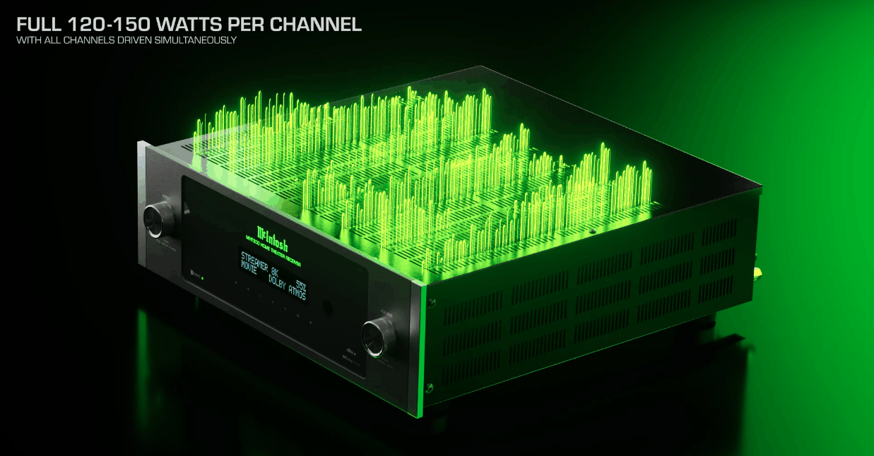 With the MHT300, the power ratings are for all seven channels being driven. That means every 4 Ohm speaker will receive 150 Watts and every 8 Ohm speaker will receive 120 Watts of heart pounding McIntosh power to bring all your favorite movies and video content to life. Every explosion, every car chase, every high-speed flyby of a fighter jet or spaceship, every roar of the crowd after a game winning score will be faithfully reproduced by 120 – 150 Watts on every one of your speakers. With the MHT300, you’ll no longer have to wonder if each speaker is getting the full power listed on the box.