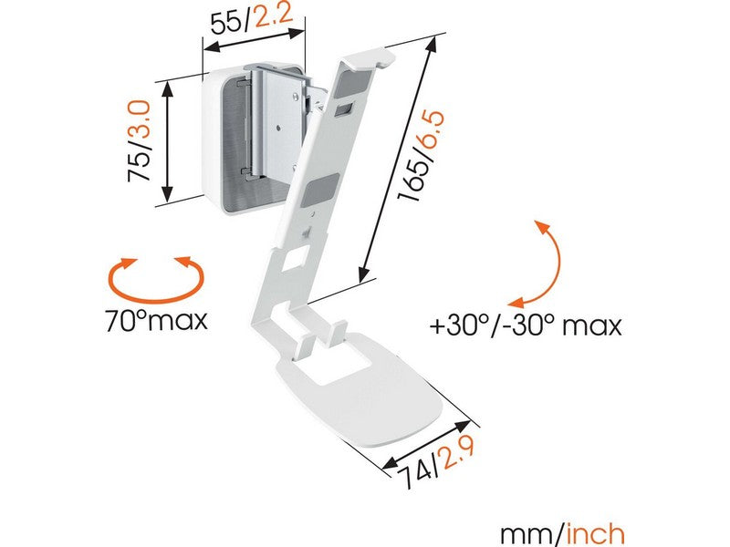 Integrate your Sonos One (SL) & Play:1 speaker seamlessly into your interior design by mounting it anywhere on your wall with the Vogel’s SOUND 4201 wall mouint. Mount the bracket high or low, out of sight or in plain view – the wide turn (70°) and tilt (30° up and down) capacity make sure that you can always angle your speaker to sound best. This low-profile speaker mount provides secure support for your Sonos One (SL) & Play:1 and comes in black or white to match the colour of your speaker. Installing the mount perfectly straight is a breeze, thanks to the integrated spirit level.