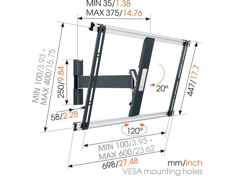 The THIN 525 full motion TV bracket has a maximum weight capacity of 25 kg. Almost any TV, from 40″ to 65″ (102-165 cm), can be mounted flat against the wall with the THIN 525. The maximum turning angle is 120° and the max. tilting angle is 20°. The distance from the wall is 35 mm.