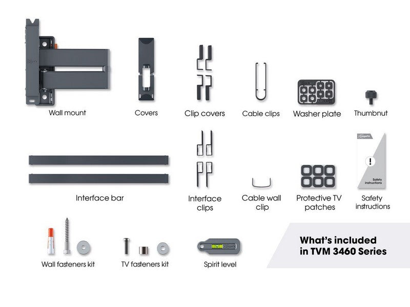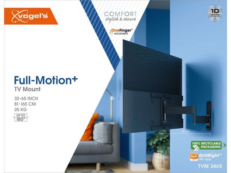 You don’t need to be a professional to install the COMFORT Full-Motion+ TV wall mount. A drilling template, screws, Fischer® DuoPower plugs, cable ties and a spirit level are included. The first drill hole is easy to mark out using our free DrillRightâ„¢ AR App.
