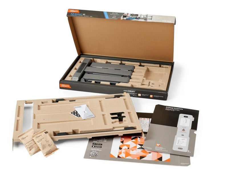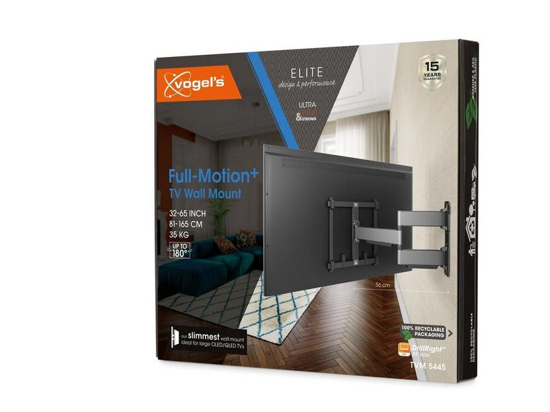 The ELITE Full-Motion+ TV wall mount is easy to install, thanks to the included Quick Install Guide with explanation. Need more help? A detailed manual is available online, plus an installation video. A spirit level, drilling template, screws and fischer® DuoPower plugs are included. Plus, the free Vogel’s DrillRightâ„¢ AR app makes it easy to mark out the first drill hole. Soft patches on the wall mount protect the back of your TV during mounting.