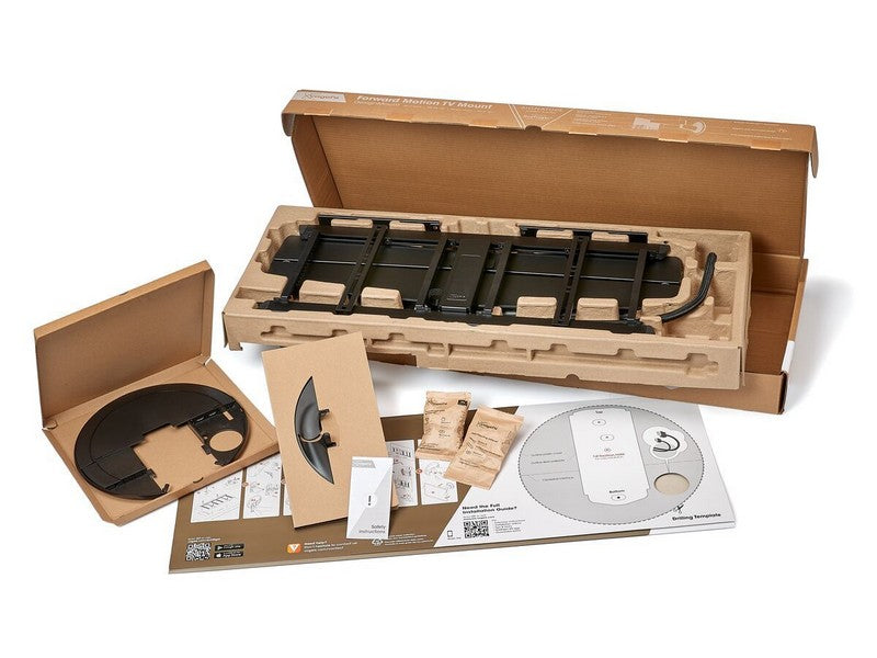 Wall mount, Interface, Wall mounting kit with fischer® Duo Power plugs, TV fasteners kit, Quick Installation Guide, DrillRight™ AR app, Drilling template, Allen key, Cable sleeve
