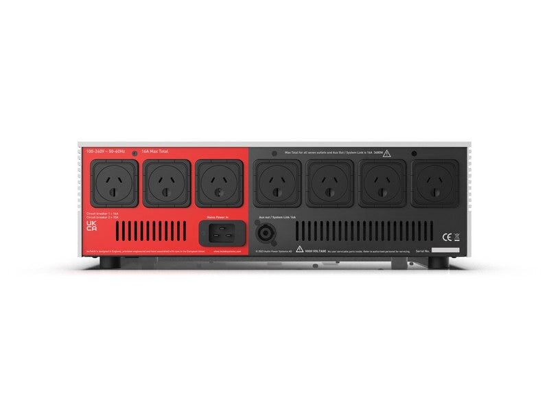 - 3 independent high current outlets for power amps, active subwoofers, active loudspeakers, TVs etc. (16A max each)