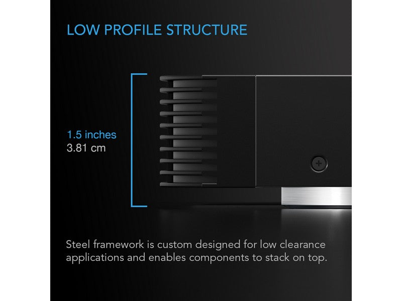 A quiet cooling fan system designed to be placed on top of AV components such as receivers, routers, game consoles, and AV cabinet components. Maintaining an optimal temperature for components prevents overheating, ensures constant performance, and extends their lifespan. The controller on the front of the cooling system features a smart thermostat trigger and fan speed control. The steel enclosure houses two dual-ball bearing blowers that pulls heat out of the component and exhausts out the rear. Its low-profile design enables the unit to fit in tight spaces. Includes corded power adapter to plug the fan system through an outlet.