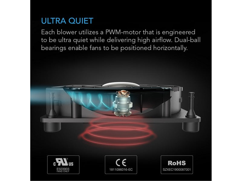Each unit contains an additional USB port, up to four blowers can be daisy chained together to share the same power source. Rated at 67,000 hours, each dual ball bearing blower is certified by CE, UL, TUV, and RoHS.