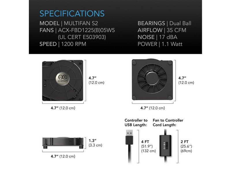 - Dimensions: 4.7 x 4.7 x 1 in. | Airflow: 35 CFM | Noise: 23 dBA