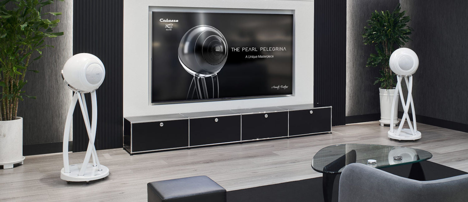 Brand connoisseurs will recognize the Lissajous curve stand – the logo that has accompanied Cabasse since its inception. THE PEARL PELEGRINA features a custom cut polished mirror metal band that circles its sphere to further enhance the many subtle details and lustrous finish, making this system a truly exclusive piece.