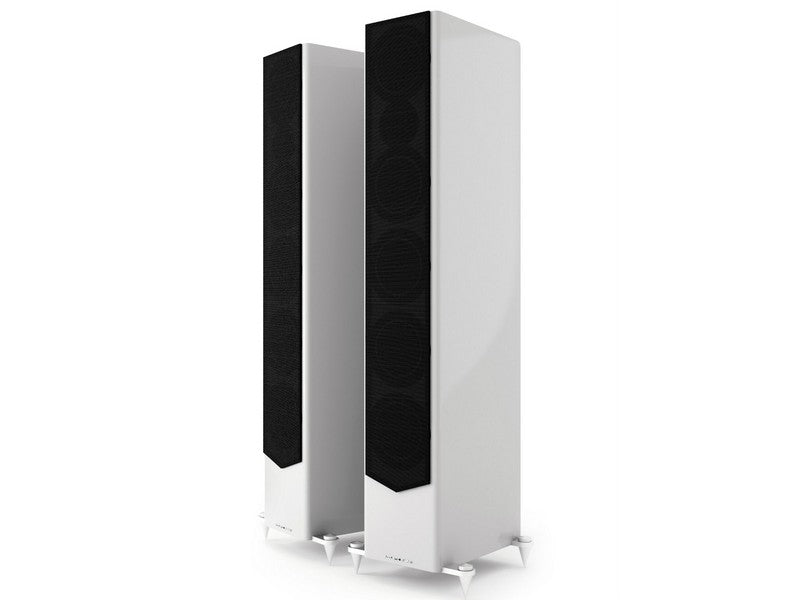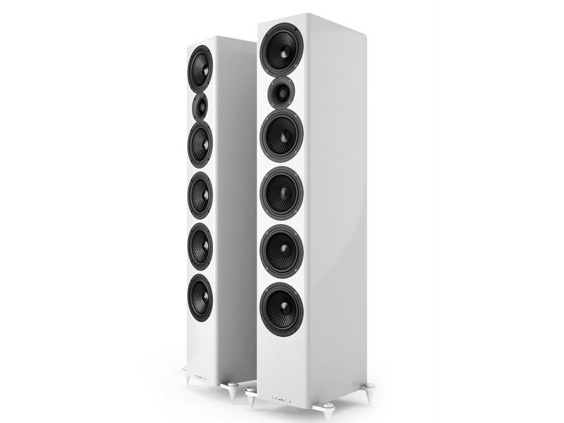 The slim-line cabinets are finished in Piano Gloss Black, Piano Gloss White or American Walnut wood veneer finishes. Solid aluminium bars are supplied to ensure rigid floor-coupling and maximum stability, whilst the stiffness of the metal structure reduces the room to speaker interaction.