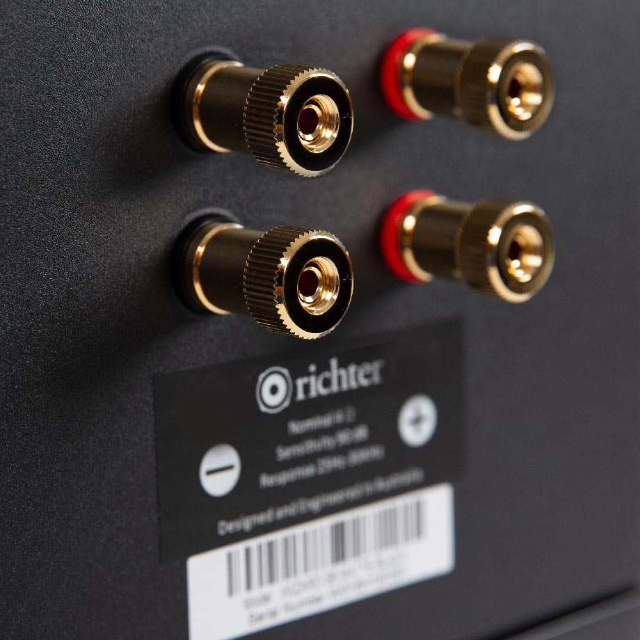 Richter S6 Special Edition speakers all use our New heavy-duty, high-Quality gold-plated Bi-Wire speaker terminal connectors which can accept a variety of connector types including: bare wire, pin connectors, spade connectors and banana plugs.