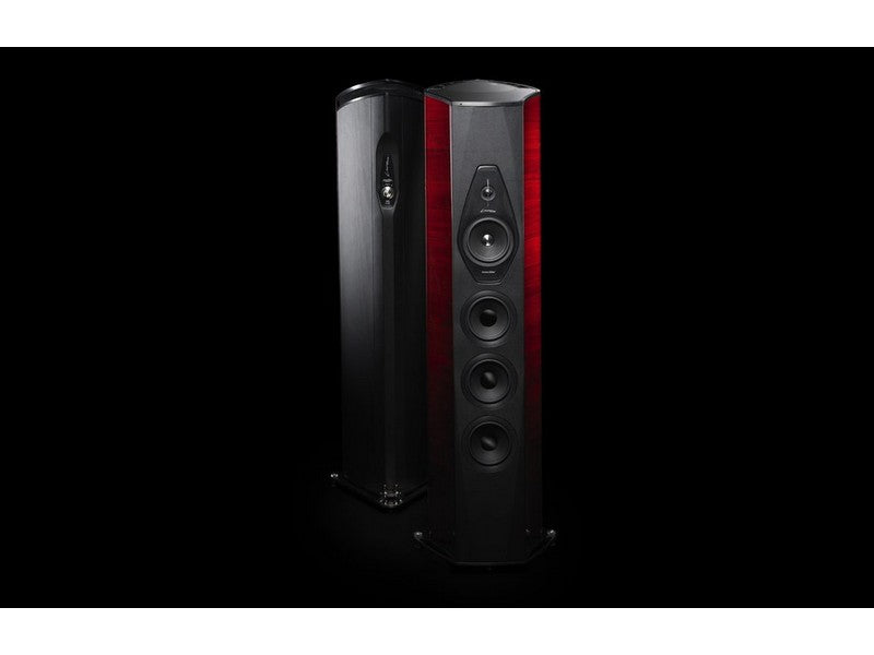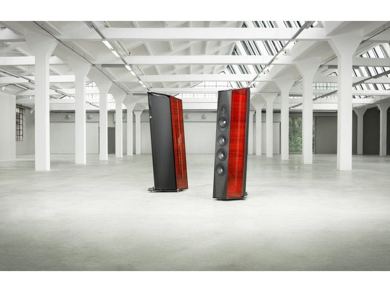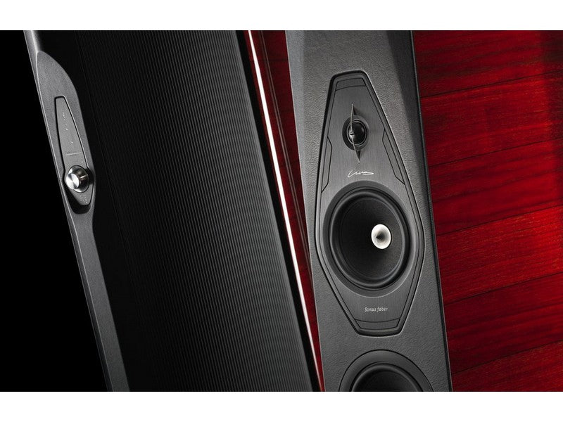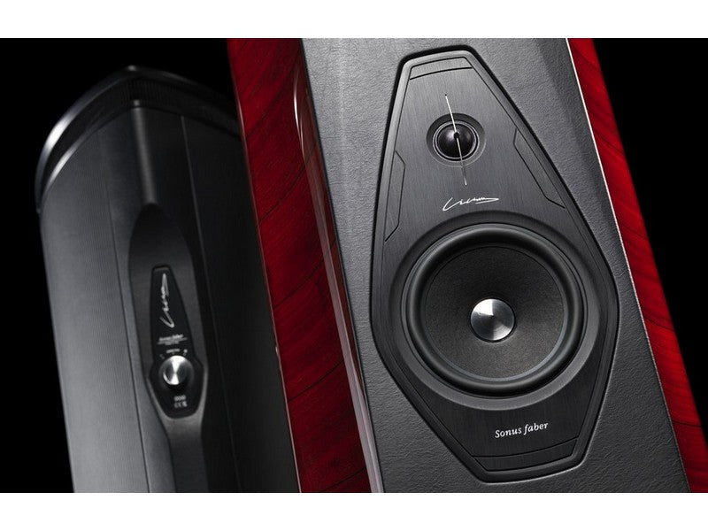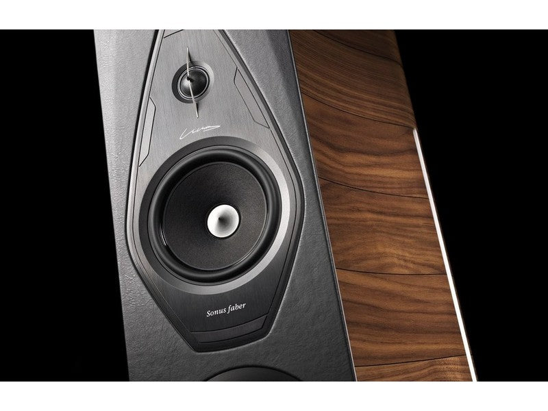 Sonus faber W18XTR-16. A triple of Sonus faber designed 180 mm lightweight “sandwich” cone structure (high-tech syntactic foam core and two external surface skins of cellulose pulp) woofers are integrated in an acoustically amorphous “stealth reflex” chamber. Designed to blend perfectly with the special midrange and, at the same time, to have absolute definition in their range: the sandwich structure with outer paper pulp skins has the same sonic character of the midrange cone. A powerful long stroke motor system with a 1,5” controlled “eddy current” voice coil is implemented for high speed, performance and linearity.