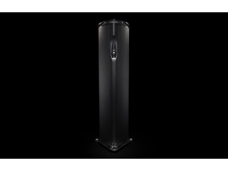 “Lyra shape” design, progressive thickness triple curvature cabinet walls damped spread resonance spectrum system, Sub–structural ribs are strategically placed for total rejection of spurious vibrations and standing waves control. Two double “dampshelves” (from “The” experience), i.e. CNC anodized machined avional “vibration dampers” (on the top and on the bottom of each cabinet) “stiffen” the column structures reducing consistently structural micro-vibrations coming from the cabinets’ walls and the transducers. The “Anima legata” system is used in an innovative way, encompassing the structural ribs of the subwoofer enclosure. A special steel rod, a high speed mechanical interface, concentrates the remaining micro-vibrations conveying them to the dual multiple “Tuned Mass Dampers”, i.e. two differently tuned special custom devices optimized to erase micro-vibrations, by oscillating in anti-phase. The subwoofer enclosure has been decoupled from the main enclosure through a new implementation of the Zero Vibration Transmission technology, a suspension system, eliminating any acoustic feedback and any vibration propagation to the listening room. The radiation of the main enclosure and of the subwoofer one are orthogonal to avoid any intermodulation.