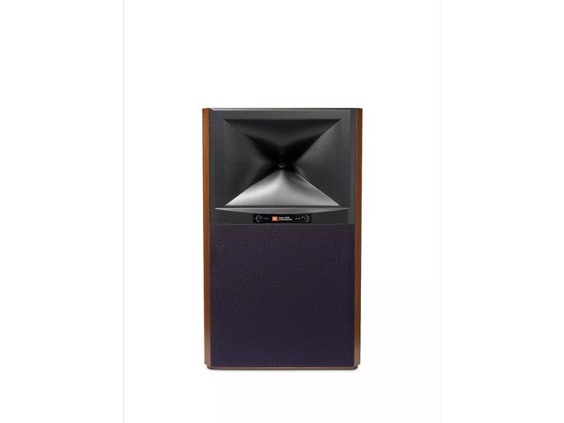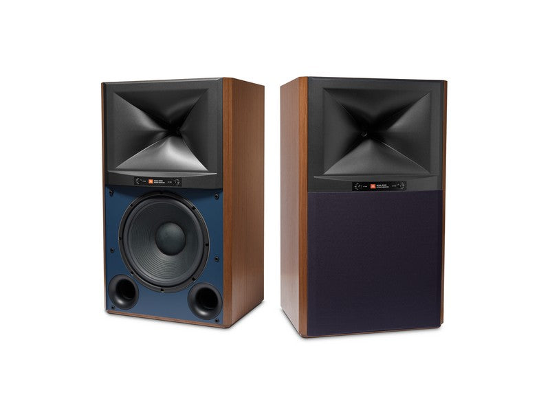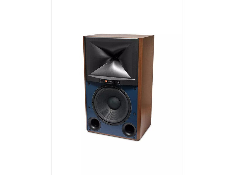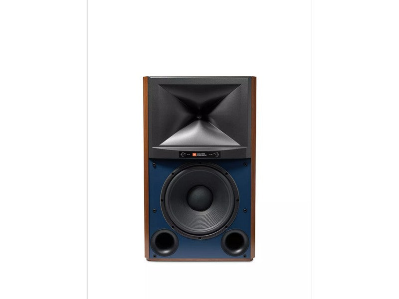 The 4349 enclosure is heavily braced with 1-inch (25mm) thick walls to provide a solid acoustic foundation and incorporates a bass reflex design with dual front-firing, computer-optimized flared ports. The cabinet features a classic JBL studio monitor design with a blue baffle and is finished in a choice of Walnut or Black Walnut furniture-grade satin wood veneers.