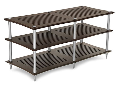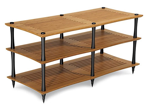 Shelves are made from solid bamboo which is available in natural or coloured. Cherry, black, dark and natural Brass collars dissipate vibrations away from electronics Slotted shelves for reduced mass & maximum ventilation Concave aluminium 32mm columns