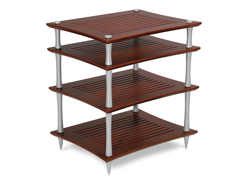 Shelves are made from solid bamboo which is available in natural or coloured. Cherry, black, dark and natural Brass collars dissipate vibrations away from electronics Slotted shelves for reduced mass & maximum ventilation Concave aluminium 32mm columns