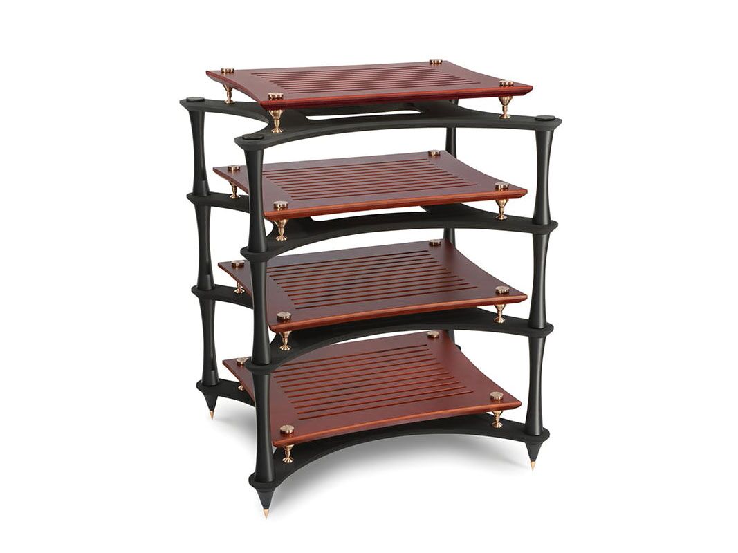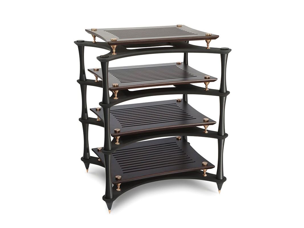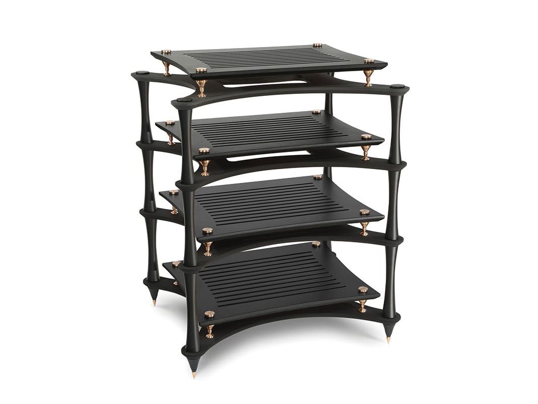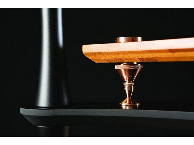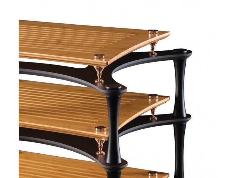 X-Reference rack is effectively ‘rack within a rack SVT Bronze isolation de-couples each shelf Inner Bamboo SVT shelving (natural or coloured) Outer Laminated Bamboo shelving coated in Nextel for sound deadening and acute edge for dissapation 44mm tapered black columns in 200, 250, 300 and 350mm.