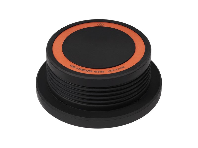 The AT618a disc stabilizer fits over the turntable spindle to hold records firmly in place, reducing resonance and improving sound quality. The stabilizer is constructed of machined brass with a protective rubber cover.