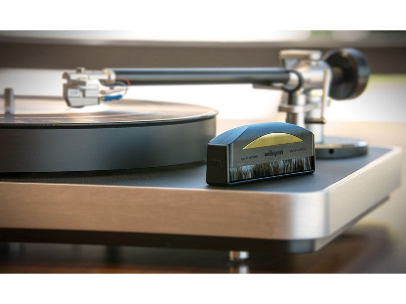 - Conductive carbon fibre bristles and conductive gold contacts remove microscopic dust before it becomes embedded in the vinyl