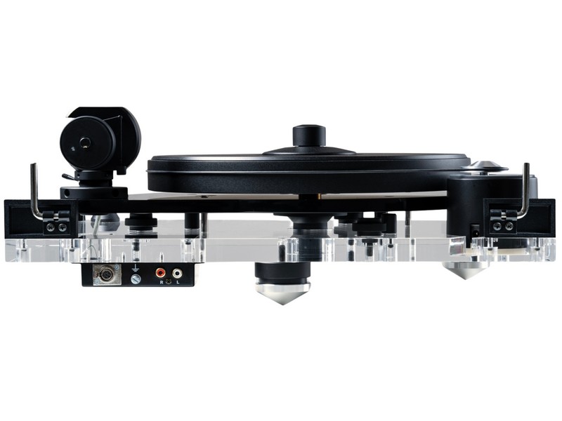 The transparent acrylic plinth stands on three individually height-adjustable TPE-damped aluminium cones and carries the motor and the sub-chassis. The sub-chassis, made of Corian, rests on three magnetic fields. A magnetic sub-chassis suspension system avoids parasitic noise normally caused by conventional spring mechanism. A quiet running AC motor unit drives the platter’s outside edge via a belt. It does incorporate an advanced DC-driven motor control, that ensures perfect speed stability and electronic speed change.